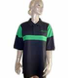 Polo short sleeve tri colored; polo collar (y/d stripe) on neck band of cleanness. two buttons placket. Contrast fabric placket; cut and sewn with contrast panel. Reflective top on chest line and on top of sleeve. zipper pocket on left sleeve. contrast panel at two side of body and bottom hem. single top stitch on each panel. hem 2 needle on sleeve low.