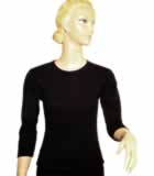 t shirt round neck, three quarter sleeve, shoulder and sleeve joint with three needle wip stitch, self material binding at neck. cut and sew body. 2 needles top stitch at sleeve end and body low