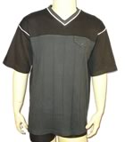 Tri colored v neck t shirt s/s. v neck 2 layers unbend of cleanness. 1x1 rib contrast piping on neck and armhole. show flap on chest with button. sweat pad at back neck. cut and sewn front with contrast color. covered top stitch 2 needle on chest line. hem 2 needle on sleeve and body low