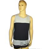 Tri colored tang top. Rib binding on neck and armholes. cut and sewn pannels with piping on chest line. two needle top stitch on binding and chest line.hem 2 needle on body low. |