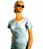 Ladies v neck top with cap sleeve neck, self fabric bindings with 2 needle top stitch. v placket on front neck. single top stitch around placket. hem 2 needle on sleeve and body low